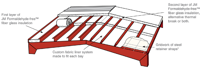 The Simple Saver roof liner system is engineered to be strong and durable for job site safety, is OSHA Compliant and a patented fall arrest system. The super strong liner system withstands the rigors of installation and provides workers beneath with protection from falling objects. The liner system then permanently supports the insulation. This limits the liability of owners, designers and contractors (Standard 29 CFR Definitions–1926.751 “Controlling Contractor”). The fall protection benefits are free, but only with the legitimate, patented Simple Saver System (Patent # 5901518).